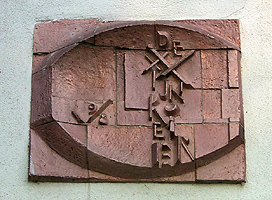 Brede Haven, in de voorgevelafmetingen: 70 x 60 cmmateriaal: Geglazuurde terracotta datering: 1982 vervaardigd door: Jeannie Lelyveld De steen bestaat uit vier delen van geglazuurd aardewerk. Het is een vierkante steen met daarbinnen een ovaal reliëf, dat het wijnvat voorstelt. In het ovaal staat links de datum 1978 (het jaar waarin de restauratie van het huis klaar was) en rechts de naam van de wijnroeier. De letters zijn opgebouwd uit pijlstokken. Binnen de omtrek van het vat zijn achter de genoemde voorstellingen de verschillende niveaus van de wijn in reliëf te zien. Dit pand had oorspronkelijk geen gevelsteen en een oude naam was ook niet bekend. De eigenaar/bewoner wilde het oude gebruik laten herleven en koos daarom een naam die wel verband hield met de haven: Wijn was een veel aangevoerd artikel en in 1399 bedroeg de wijnaccijns zelfs de helft van het inkomen van de stad. Voor het innen van de belasting was er een beëdigd ambtenaar, die moest bepalen met een pijlstok hoeveel wijn er in een vat zat. Dit was de wijnroeier. de kunstenares kreeg de opdracht dit beroep in de steen uit te beelden. | 94 |