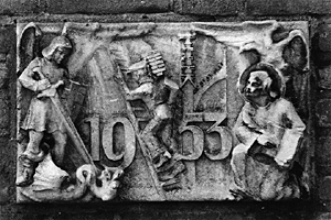 Hertogin Johannastraat 1, in de zijgevel zijde Pettelaarsewegafmetingen: 40 x 30 cmmateriaal: natuursteen datering: 1953 vervaardigd door: Jacques de Bresser In een traditioneel/naturalistisch hoogreliëf zijn afgebeeld werkzaamheden aan de kathedraal, St. Joris en de draak en het jaartal '1953'. Dit huis was destijds eigendom van de aannemer Van der Linden, die ook werkzaamheden verrichte bij de restauratie van de kathedraal. | 61 |