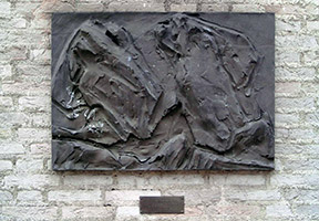 Kerkstraat / hoek Korte Putstraat, in de gevel van het postkantoorafmetingen: 81 x 56 cmmateriaal: brons datering: 1985 vervaardigd door: Willem K. Vreeswijk Twee kikvorsen gezien in vogelperspektief en geboetseerd in grove, impressionistische stijl. Volgens de bijgaande tekst is het reliëf 'aangeboden door Oud-Bosschenaren'. De jaartallen '1185-1985' worden vermeld, dus het reliëf is klaarblijkelijk aangeboden ter gelegenheid van het achthonderd-jarig bestaan van de stad. | 99 |