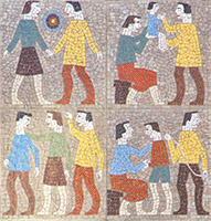De mozaïeken bij de ingang van de bovenwoningen aan de Jacob van Maerlantstraat bestaan uit vierkanten van ongeveer 50 x 50 cm, die elk een scène voorstellen in een sterk abstraherende stijl. Het onderwerp van het volgende mozaïek [2] is het gezin. De cyclus van het gezinsleven wordt in vier scènes uitgebeeld, vanaf de verbintenis tussen man en vrouw, de komst van het kind, de opvoeding, tot aan het vertrek van de volwassen zoon. Hierbij komt tevens het rolpatroon tussen man en vrouw naar voren: de moeder tilt het kind op en toont het aan de vader; de moeder voedt het kind op terwijl vader aan het werk is; de moeder en vader nemen ieder op hun eigen manier, afscheid van de volwassen zoon. De figuren zijn in profiel voorgesteld. Hoewel hun gezichten geen individuele trekken hebben gaat er toch een grote zeggingskracht van uit, vooral bij de scène van het afscheid van moeder en zoon. Wordt in dit mozaïek, hier in de straat, de centrale positie van het gezin in de samenleving zichtbaar gemaakt? | 19 |