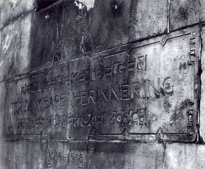 Na afloop van de Wereldoorlog hebben de gedurende deze strijd in Den Bosch verblijvende Belgische vluchtelingen de stad een herdenkingsplaquette geschonken, die gebeiteld werd in de voorgevel van het stadhuis, ter rechterzijde van het bordes. Op zaterdag 14 december werd deze plechtig overgedragen op het stadhuis, als dankbare herinnering aan het verblijf van de vluchtelingen in onze stad.