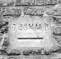 Waterhoogtesteen in de muur van de Mortelkazerne. 7.23 NAP (=1.10 meter boven de grond)