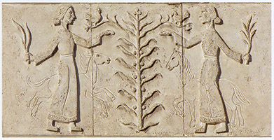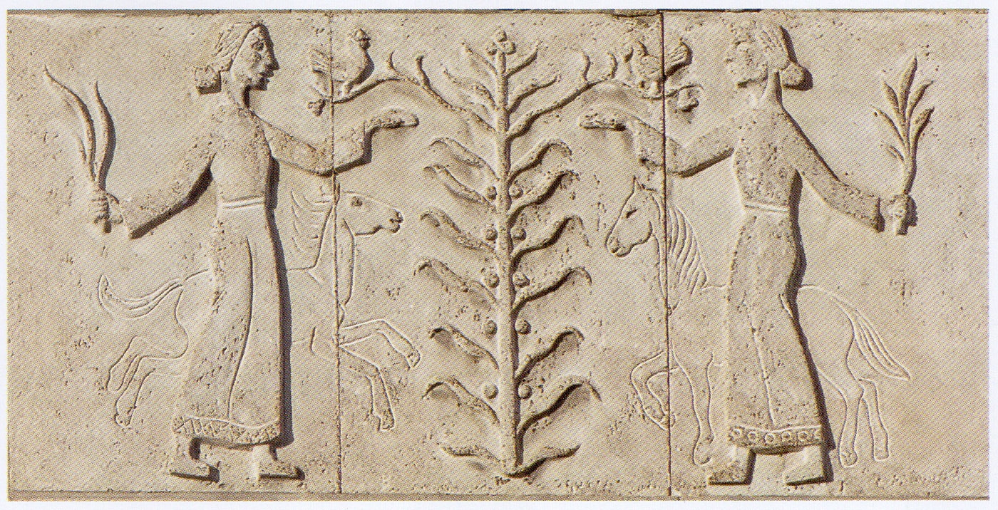 Bij de huizenblokken aan de Obrechtstraat ontdekken we twee reliëfs: op het ene [22] zijn ook weer twee vrouwen voorgesteld, zwaaiend met twijgen of korenaren. Ze dansen rond een boom met vogeltjes, met op de achtergrond twee herten. Het andere reliëf [23] stelt in het midden een man voor in frontale houding, die een span met twee paarden vasthoudt. | 22 |