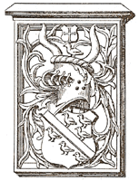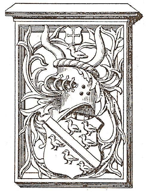 Cimier: une merlette de gueules entre deux cornes de buffle d'argent, chargées celle à dextre de trois bandes et celle à senestre de trois barres de gueules.