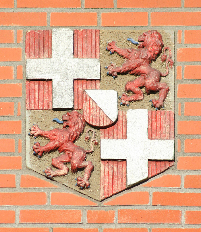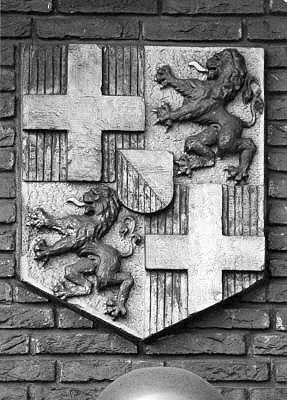 Afbeelding van het provinciewapen van Utrecht aan de gevel van het gebouw rechts van het station (R. Steenhuis).