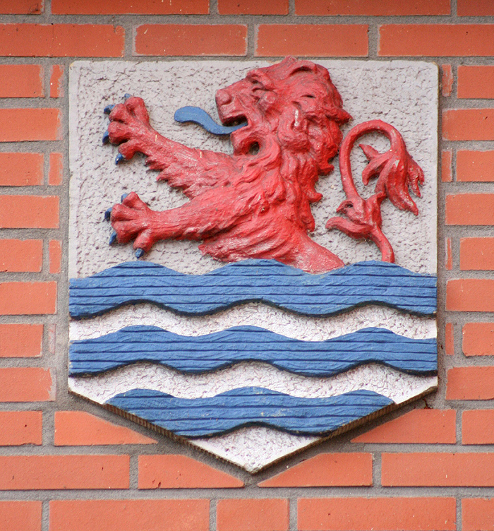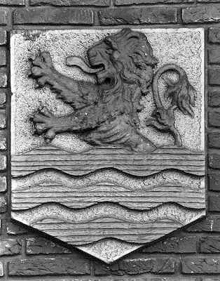 Afbeelding van het provinciewapen van Zeeland aan de gevel van het gebouw rechts van het station (R. Steenhuis).