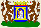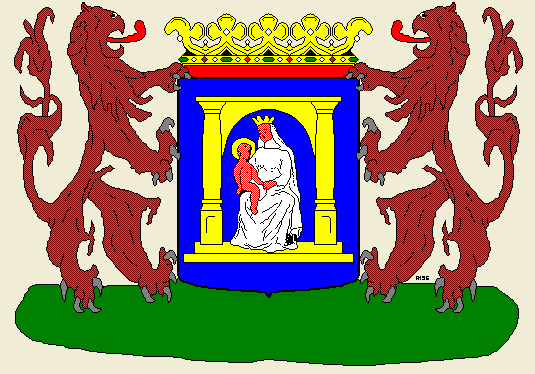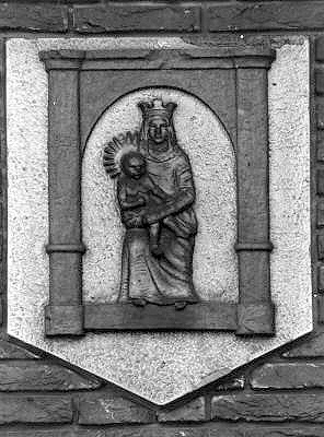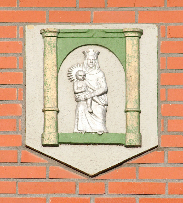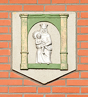 Afbeelding van het stadswapen van Assen aan de gevel van het gebouw rechts van het station (R. Steenhuis).