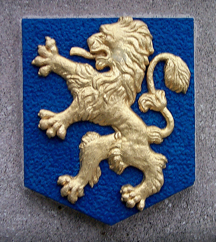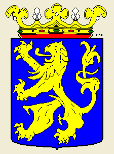 "Van lazuur beladen met een klimmende leeuw van goud. Het schild gedekt met een gouden kroon."
