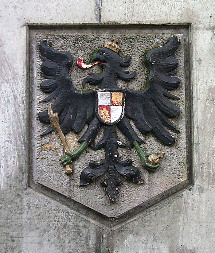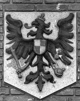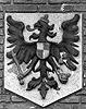 Wapen van Duitsland op een van de betonnen pilaren van de bushalte.