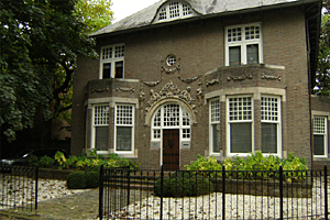 Van der Does de Willeboissingel 13 / hoek Capucijnenlaan, aan de voorgevelmateriaal: natuursteendatering: 1910 maker: onbekend Barokke versieringen met twee putti, loofwerk, fruit en bloemen boven ingang en ramem. Het huis werd in 1910 gebouwd door architect P. Kuipers in opdracht van G.J.P. Daniëls. Op de bouwtekening staan de ornamenten rond de deur gedetailleerd ingetekend. | 33 |