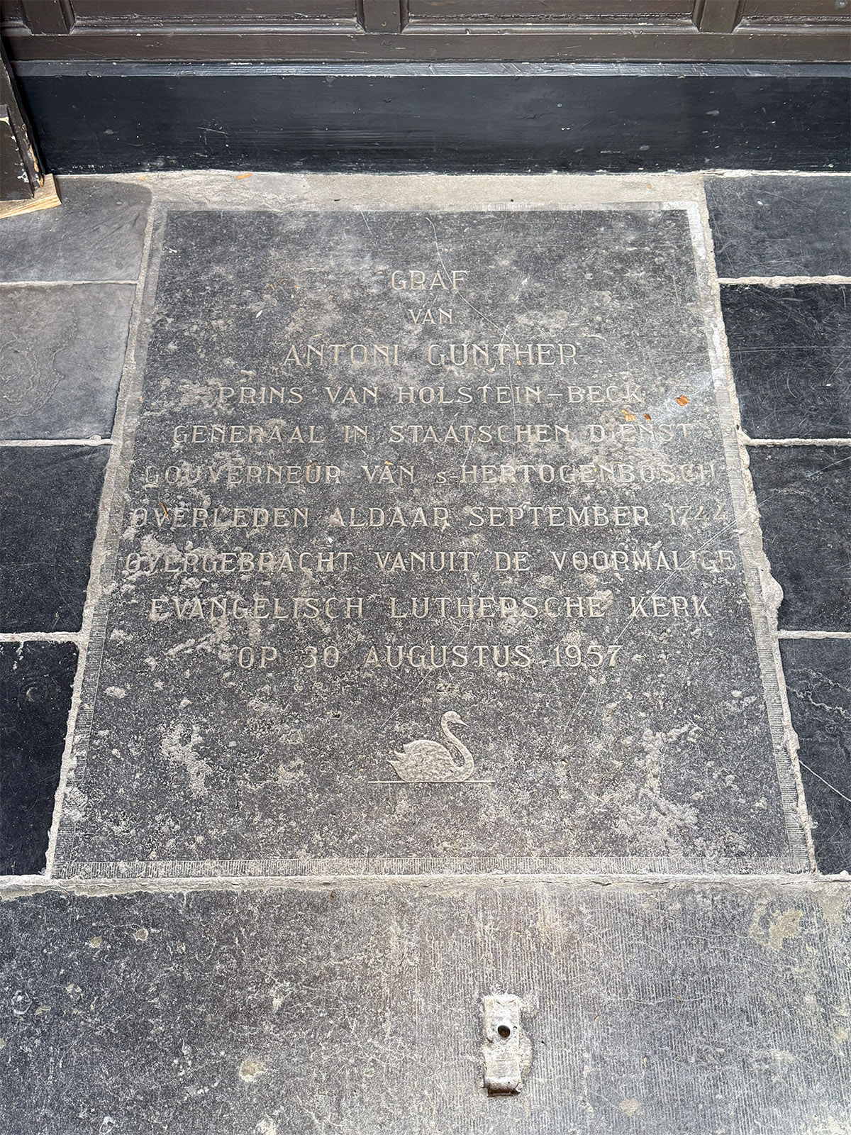 moet het lijk binnen acht dagen verdwenen zijn, terwijl dan tevens de kelder in de oorspronkelijke staat moet verkeren. Men is tot overeenstemming gekomen, want op 2 mei 1745 wordt f 37-10-05 betaald als begraafrecht aan de koster van de St-Catharina7,8. In september 1744 was reeds vermeld: "Op order van de Ed. agtb. Heeren geluit met den grooten Bom, daer onder geklept agt daagen agter Een samen 23 uuren Ter oorsake vant afsterven van zijn Hoogheijt den Heere prinse van Holstein-Beck, gouverneur Deser stad, jura voor den koster f 57-10,--. 15 September bijgeset inde Luetersche Kerk/ Memorij apostelstraet parochie St.Catrijn". Het verblijf van de Prins van Holstein-Beck te 's-Hertogenbosch is -tegen zijn intentie- permanent geworden. Hoewel zijn wapenbord aangebracht was aan het orgel, is de aanwezigheid van de grafkelder van de prins in de vergetelheid geraakt. Kennelijk is de belangstelling van de erfgenamen voor de erflater niet groot geweest! 9. In 1956 is de kerk verkocht en afgebroken. Toen kwamen de stoffelijke resten weer te voorschijn. Samen met de inventaris van de kerk werd de prins van Holstein verhuisd naar de nieuwe Ev. Lutherse kerk, eveneens in de Verwerstraat10. Echter, voor het transport van de voormalige gouverneur van 's-Hertogenbosch was toestemming nodig van zijn naaste familie. Zijn naaste verwant bleek Z.M. Koning Frederik IX van Denemarken te zijn! Deze heeft de Deense ambassadeur in Nederland, Wilhelm Eickhoff, op 13 maart 1957 laten weten geen bezwaar te hebben tegen deze overbrenging11. Op vrijdag 30 augustus 1957 is het stoffelijk overschot in alle eenvoud bijgezet in de nieuwe Ev. Lutherse kerk, waar nu een eenvoudige hardstenen plaat in de vloer van het portaal van de kerk herinnert aan de aanwezigheid van de prins. | 120 |