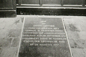 | 8. | Bij het verlenen van toestemming tot het bouwen van de Ev. Lutherse Kerk werd bepaald, dat bij begraven in deze kerk, de kerkerechten aan de parochiekerk, waaronder de overledene ressorteerde, betaald moesten worden. |
