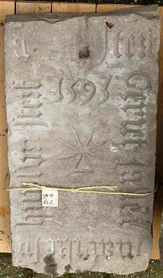Een hardstenen grafzerk, met in het midden een maltezerkruis en een opschrift.
