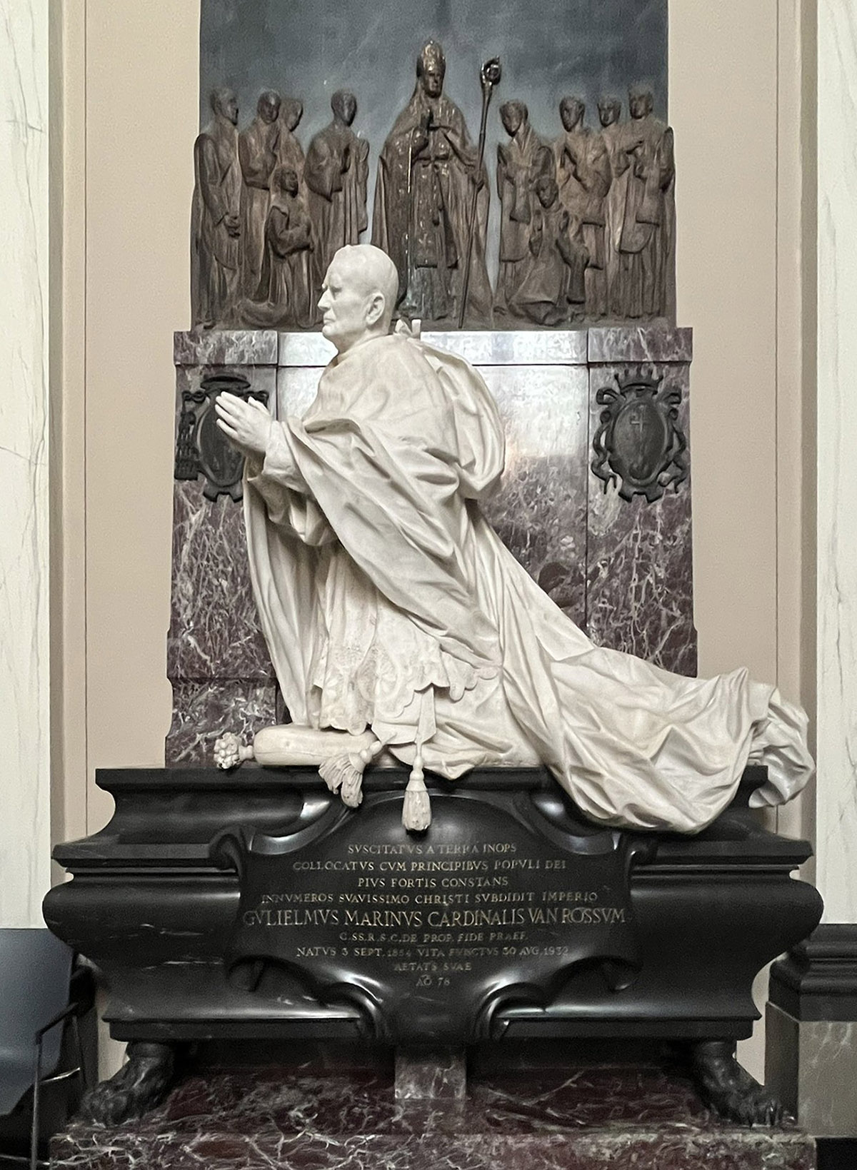 Een indrukwekkend grafmonument domineert de kloosterkerk van Wittem. Gehuld in zijn opvallende kardinaalskledij (een ’cappa magna’) knielt kardinaal Willem van Rossum (1854-1932) in barokke zwierigheid op een kussen, zijn handen devoot gevouwen en zijn ogen gericht op het altaar.