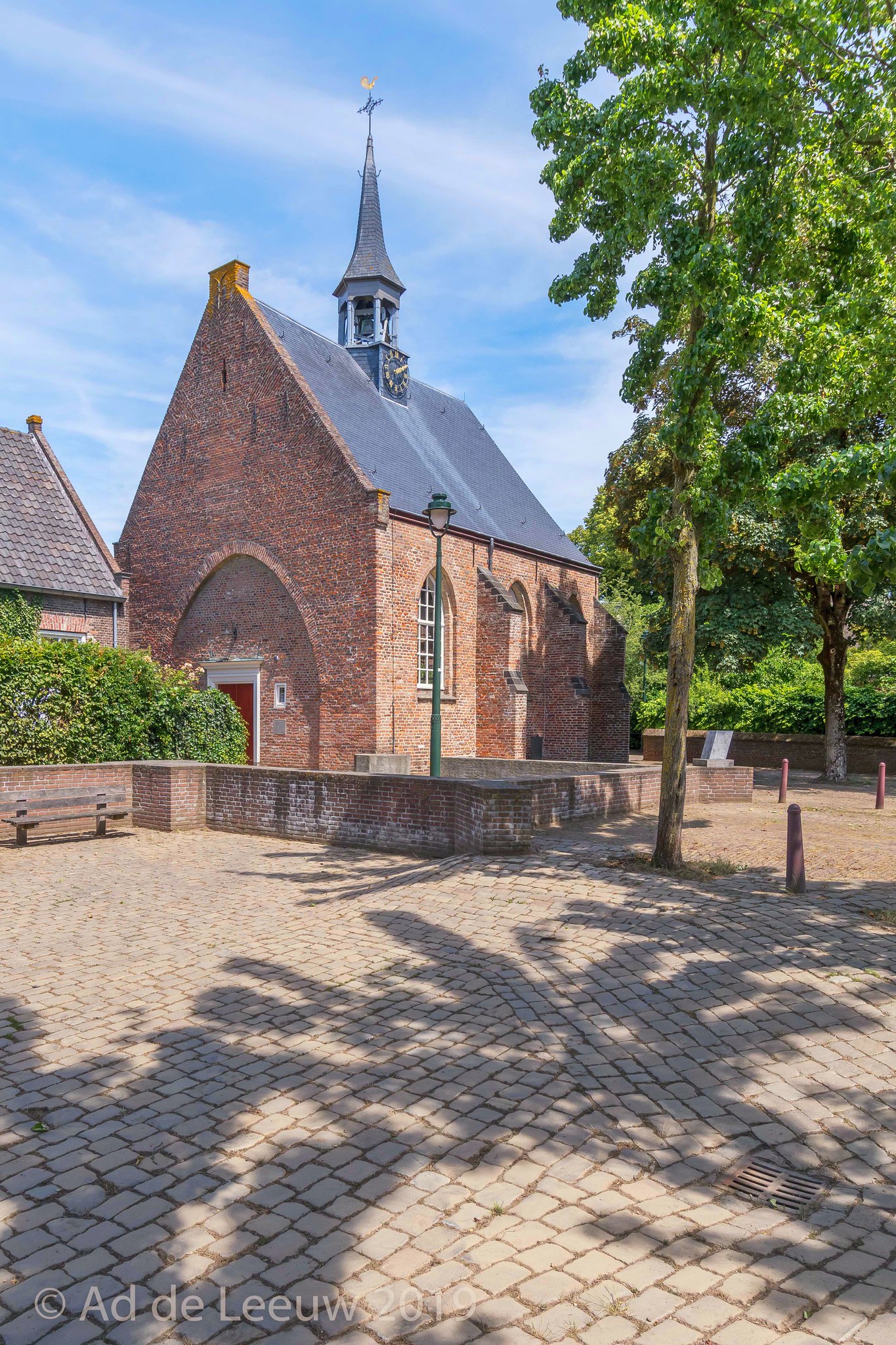 Geďnteresseerd als ze bovendien is in de historie van 'het oudt floressante Engelen', is zij de aangewezen persoon om ons door dit protestantse kerkje op katholieke bodem te leiden. Vanwege de oude verbondenheid van de vroegere ‘pastorie-huysinghe’ met de kerk is het voor Ans Vermeijden via tuin en achterpoort maar een paar stappen naar de kerk, waarvan de geschiedenis op een ANWB-plaquette naast de kerkdeur al bij aankomst kort staat weergegeven. Het kerkje blijkt gevestigd in het koorgedeelte van de middeleeuwse parochiekerk Sint-Lambertus. Tijdens de Slag bij Engelen in 1587 (Tachtigjarige Oorlog) wordt de trots van ‘het fraaije dorpje Engelen, schilderachtig aan de Dieze gelegen’ grotendeels verwoest. Alleen het koor bleef zodanig intact dat het hersteld kon worden om vervolgens – in het kader van de maatregelen van de Staten van Holland om het calvinisme in te voeren – dienst te gaan doen als gereformeerde kerk. De rest van de kerk werd met de grond gelijk gemaakt. De contouren van het vroegere kerkschip zijn echter op het kerkplein terug te vinden in lage opgemetselde muren. De contouren van de toren zijn verwerkt in het plaveisel. Voor wie meer wil weten is het enige maanden | 139 |