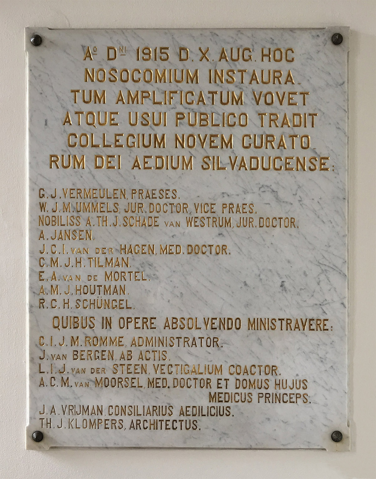 InleidingHet ziekenhuis met zusterklooster en kapel is gelegen aan de westelijke zijde van het terrein van het Groot Ziekengasthuis. Vanaf 1880 werd de zorg voor de zieken in het Groot Ziekengasthuis verzorgd door de zusters van de Congregatie van Barmhartige Zusters van de Heilige Carolus Borromeus. De bouw van het ziekenhuis annex klooster dateert uit ca. 1915. Het klooster werd opgetrokken in een Neo-Renaissancestijl, met elementen van de Neo-Gotiek. Het geheel werd ontworpen door de architecten J. Vrijman en Th. J. Klompers. In de na-oorlogse periode werd het ziekenhuis/klooster aan de noordzijde uitgebreid met een liftuitbouw en een éénlaags aanbouw onder plat voor verpleegzalen.OmschrijvingHet ziekenhuis annex klooster heeft een globaal U-vormige plattegrond. Aan de achterzijde (noordzijde) in het midden een aanbouw voor een kapel. Het gebouw heeft een samengesteld dak, gedekt met leien. De kapel is voorzien van een wolfdak, gedekt met leien, waarop een dakruiter. In het dakschild boven de voorgevel van het ziekenhuis/klooster dakkapellen met dwarsgeplaatst zadeldakje en T-raam. Geprofileerde bakgoot. De gevels zijn opgetrokken in baksteen met speklagen in gele verblendsteen. Natuurstenen waterlijsten, waaronder friezen in siermetselwerk. Hardstenen vensterdorpels. Onder de goot een tandlijst. Smeedijzeren sierankers. De voorgevel (zuidgevel) bestaat voor twee derde uit een vleugel onder schilddak, aan beide zijden afgesloten door hoekrisalieten met trapgevel en dwarsgeplaatst zadeldak. Boven de meest linkse trapgevel een natuurstenen wapendragende leeuw. Direct links hiervan een driezijdig gesloten, hoger opgetrokken bouwdeel voor het trappenhuis. Geheel links een L-vormige vleugel onder plat, aan de bovenzijde afgesloten door een bakstenen balustrade met overhoeks geplaatste pinakels. De voorgevel is voorzien van getoogde vensters, waarin T-ramen met een drieruits bovenlicht. Ontlastingsbogen met natuurstenen aanzet- en sluitstenen. In de trapgevels, ter hoogte van de zolderverdieping, kleinere getoogde vensters met T-ramen en bovenlichten met kleine roedenverdeling. In de meest linkse risaliet met trapgevel de hoofdingang van het ziekenhuis bestaande uit een vleugeldeur met panelen en sierroosters. Getoogd bovenlicht en smalle getoogde zijlichten, voorzien van glas-in-lood. Boven de ingang een in glas en ijzer uitgevoerde luifel, met gietijzeren waterspuwers. In de trappenhuisuitbouw getoogde vensters met tweeruits ramen, waarin glas-in-lood. Op begane grondniveau kleine gekoppelde getoogde vensters. De korte westelijke vleugel heeft in het midden van de westelijke gevel een terugspringende gevelpartij. De vleugel, waarin voornamelijk dienstruimtes waren ondergebracht, is voorzien van getoogde vensters met T-ramen. Kleine roedenverdeling in de bovenlichten. Van de korte oostgevel gaat de begane grond grotendeels schuil achter een éénlaags moderne aanbouw voor een bergplaats. Op de bovenverdieping is de over twee bouwlagen aangebrachte driezijdige erker zichtbaar, waarin ter hoogte van de recreatiezaal op de eerste verdieping brede vensters met T-ramen en drieruits bovenlichten. In het gevelgedeelte rechts hiervan getoogde vensters met T-ramen en drieruits bovenlichten.De éénbeukige kapel aan de noordzijde van het ziekenhuis/klooster telt vier traveeën en heeft een 5/8 koorsluiting. In de westelijke en oostelijke gevel is de kapel voorzien van grote spitsboogvensters met maaswerk: de gevel is ter plaatse van de vensters hoger opgetrokken en wordt hier afgesloten door steekkappen met wolfeind. Onder de vensters muurnissen. In de koorafsluiting lancetvensters met glas-in-lood. Rechts van de kapel gaat de achtergevel op de begane grond grotendeels schuil achter een moderne éénlaags aanbouw onder plat met verpleegruimtes. Direct rechts van de kapel een liftuitbouw. Rechts, ter plaatse van behandelkamers op de eerste verdieping een door een (later aangebrachte) luifel afgedekt balkon met smeedijzeren balkonhek. Zowel de oostelijke zijgevel van de kapel als de achtergevel van het ziekenhuis/klooster gaan op begane grondniveau schuil achter een moderne éénlaags aanbouw onder plat, waarin dienstvertrekken. De vertrekken zijn in de achtergevel voorzien van getoogde vensters met T-raam. De achtergevel wordt afgesloten door een bakstenen balustrade. Inwendig toont het ziekenhuis annex klooster in hoofdlijnen nog de oorspronkelijke hoofdopzet: in het midden van het gebouw de entree en vestibule, met schuin hierachter de kapel. Links van de entree de ziekenzalen, dienstvertrekken en kantoortjes voor het lekenpersoneel, rechts van de entree het kloostergedeelte. Tegen de achtergevel een gang. Direct links van de entree een spreekkamer en de regentenkamer. Links hiervan verpleegruimtes. Rechts van de entree op de begane grond de kamer van moeder overste, een bibliotheek en eetzaal, op de bovenverdieping de slaapkamers van de zusters. Van het oorspronkelijke interieur resteert nog een aantal elementen. Vestibule met tochtdeur, waarin glas-in-lood. Hierachter wordt de doorgang tussen de hal en achterliggende gang gevormd door een arcade op granieten Toscaanse zuilen. In de hal een bronzen reliëf met portret van dr. A.C.M. van Moorsel (1900-1925). In de gang nog enkele oorspronkelijke tochtdeuren met zij- en bovenlichten. Trappenhuizen, waarin hardstenen steektrappen met smeedijzeren balustrade en houten leuning. Glas-in-loodramen. De kapel heeft een houten tongewelf met steekkappen, dat grotendeels schuil gaat achter een verlaagd plafond. Het koor wordt afgesloten door een bakstenen kruisgewelf. In de meest zuidelijke travee een zangkoor. Hieronder een bakstenen kruisgewelf, rustend op consoles met koolbladdecoratie. Rechts van de kapelingang een marmeren wijwaterbakje. WaarderingHet ziekenhuis annex klooster met kapel, behorend bij het Groot Ziekengasthuis, is van algemeen belang. Het ziekenhuis bezit cultuurhistorische waarde als bijzondere uitdrukking van een sociaal-economische en