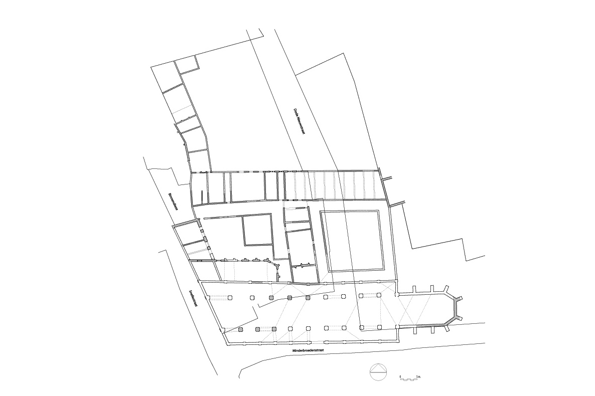 Voorafgaand aan de huidige nieuwbouw, zijn in de jaren 1985/1987 door de Bouwhistorische en Archeologische Dienst van de gemeente 's-Hertogenbosch opgravingen verricht naar de resten van het zogeheten Minderbroedersklooster. Dit complex strekte zich uit vanaf de vestiging van Vroom & Dreesman in de Snellestraat tot aan de Markt. Het lag juist binnen de oudste stadsmuur, die in het begin van de 13e eeuw is aangelegd. Waarschijnlijk is het Minderbroedersklooster kort na 1228 gesticht, mogelijk onder speciale bescherming en op privé-grondgebied van Hendrik I hertog van Brabant. Het is een van de oudste vestigingen van de Minderbroeders (Fransciscanen) in Nederland. Bij de opgravingen bleek dat de 13e eeuwse resten van het klooster tijdens latere bouwactiviteiten grotendeels zijn verdwenen. Wel is een deel van de oorspronkelijke stadsmuur teruggevonden. Nadat in het midden van de 14e eeuw een nieuwe, veel ruimere ommuring was aangelegd, moest deze oude stadsmuur wijken voor een uitbreiding van de kloosterkerk. In de 15e eeuw werd aan de noordzijde van de kerk een Mariakapel gebouwd. Naast het kerkgebouw bevond zich een woongedeelte, dat grensde aan de kloostergang. Nadat 's-Hertogenbosch in 1629 was veroverd door Frederik Hendrik, werden de monniken gedwongen de stad te verlaten. De gebouwen zijn kort daarna gesloopt. Met het sloopmateriaal bouwde men vervolgens enkele huisjes, de Dode Nieuwstraat en de Minderbroedersstraat werden toen aangelegd. De huisjes hebben hier tot na de tweede wereldoorlog gestaan. Na de voltooiing van de nieuwbouw in 1988 zijn in de bestrating het verloop van de eerste stadsmuur, de loop van de Dieze en een aantal kolommen van de kloosterkerk aangegeven. |