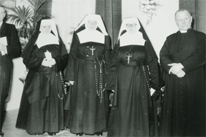 Viering 100 jaar religieuze verpleegkundige verzorging in het gesticht. Recipiėrende zusters van de congregatie van de Zusters van Barmhartigheid van Ronse met rechts hun algemeen directeur Eug. Heyerman. Reinier van Arkel.