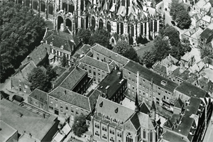 Vlakbij de Sint-Jan, in de lommerrijke Choorstraat treffen we naast de plebanie enkele statige, negentiende eeuwse gevels aan. Voor een deel zitten er schoolgebouwen achter deze gevels. Maar dat is niet het geval bij: Choorstraat 7. In het begin van de negentiende eeuw woonde in 's-Hertogenbosch een vrome dame, Catharina Verhees, in de wandeling 'het Heilig Kaatje' genoemd. Zij was sociaal bewogen en kwam in aanraking met Jacobus Heeren, de kapelaan van de Sint-Jacob. Hij had in het begin van die eeuw eveneens kennis gemaakt met verwaarloosde kinderen uit zijn parochie. Voor een deel waren dat halfwezen, waarvoor in de Bossche weeshuizen geen plaats was, en waar men thuis moeilijkheden had. Kapelaan Heeren wist naast Vatharina Verhees ook enkele andere dames te interesseren voor dit liefdewerk. Het aantal hulpdames groeide. Op 7 juli 1820 werd een congregatie gesticht: De Congregatie der Dochters van Maria en Jozef. Op deze dag, de feestdag van O.L. Vrouw van 's-Hertogenbosch, betrokken zij een pand in de Choorstraat. Hieraan werd hun populaire benaming ontleend: 'De zusters van de Choorstraat'. Maar naar buiten toe werd alle schijn van een klooster vermeden: die mochten in die tijd namelijk niet opgericht worde. Men sprak elkaar onderling met juffrouw aan en gebruikte de familienaam. Natuurlijk werd er evenmin religieuze kleding gedragen. Het 'heilig Kaatje' werd de eerste overste van het 'klooster'. In het huis van de orde werden arme vrouwen opgenomen. Geen wezen; die werden elders uitbesteed. In 1838 begon de congregatie met het geven van onderwijs. Pater Heeren gaf zelf een half jaar les, daarna moesten de 'juffrouwen' het zelf gaan doen. In het midden van de negentiende eeuw, in 1843, kon de congregatie officieel goedgekeurd worden. In die periode werd ook de Regel aangenomen en in 1850 de pauselijke goedkeuring verkregen. De hoofdtaak van de orde werd het geven van onderwijs. Voor dit doel werd bij het klooster onder meer in de jaren 1908-1911 bij het moederhuis een kweekschool met internaat en een eigen kapel gebouwd. Niet alleen de eigen zusters kregen hier een opleiding, maar ook leken. De Bossche orde breidde zich uit en kreeg elders ook afdelingen. Zeventig jaar geleden stichtte men zelfs een klooster in Oost-Mongolië, in Sung-chou-tsoei-tze. De orde is de enige orde in 's-Hertogenbosch gesticht is en hier haar moederhuis heeft. Evenals andere orden lopen het aantal roepingen de laatste decennia sterk terug. Kloostergebouwen komen leeg en krijgen andere bestemmingen of worden gesloopt. Met het klooster in de Choorstraat is dat nog niet het geval. Achter de voorgevel van Choorstraat 7 zijn een groot aantal appartementen gebouwd, zich uitstrekkend tot aan de Casinotuin, waar de inmiddels gepensioneerde zusters wonen. Nog steeds in de directe nabijheid van de Sint-Jan. |