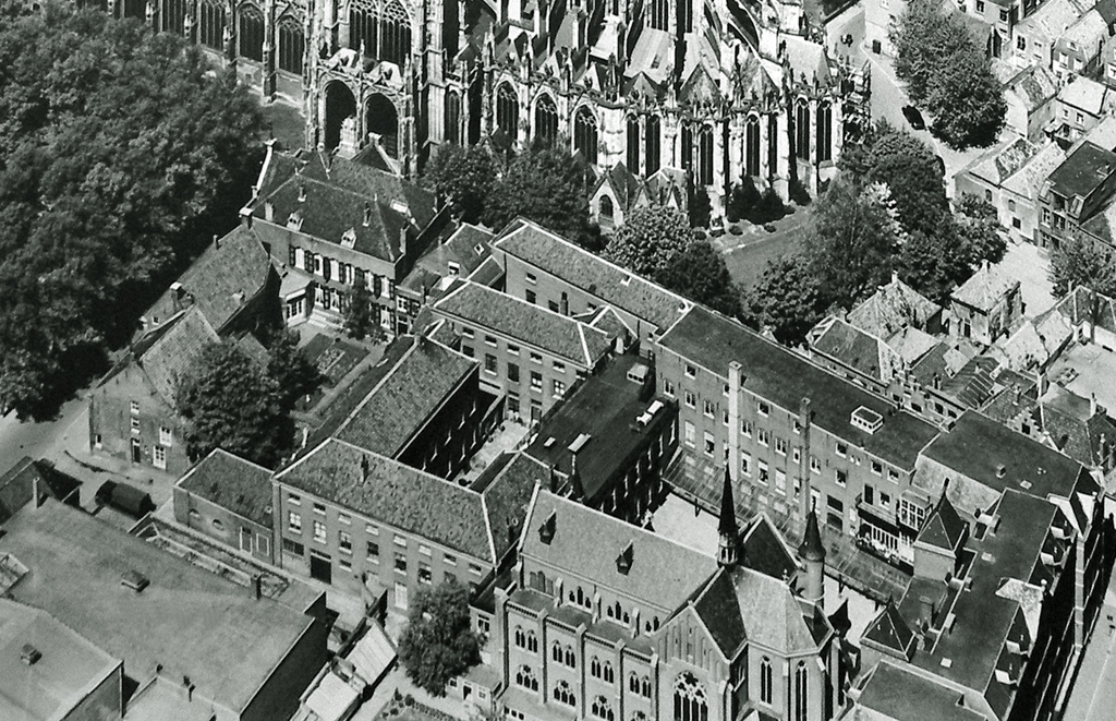 werd verkocht en van de tapijten werden dekens gemaakt voor de vrouwen. Het huis was klaar om de ´kloosterlingen´ te ontvangen. Na een bedevaart naar Kevelaer betrokken vijf juffrouwen - zoals eerder gezegd - de woning op 7 juli 1820, de feestdag van de Zoete Lieve Vrouw van Den Bosch. Het waren de eerste ´Zusters van de Choorstraat´. Op 3 maart 1821 kocht Everardus van Grinsven - voor rekening van het Liefdehuis - het deel van de woning dat eigendom was van Van der Kallen en nadat hij in 1833 was overleden erfde zijn dochter Catharina van Grinsven het huis. Zij was van 1825 tot 1855 de algemeen overste van de congregatie. Het huis werd in 1836 overgedaan aan de gemeenschap van ´Zusters´. Tijdens Catharina´s bestuursperiode, kreeg de gemeenschap van vrouwen juridisch bestaansrecht in 1843 en is het onroerend goed overgedragen aan het ´Zedelijk Ligchaam genaamd Vereeniging van vrouwen tot het geven van onderwijs In Omnibus Charitas´. De datum 19 juli, feestdag van de heilige Vincentius à Paulo, speelde bij de totstandkoming van de notariële acte een belangrijke rol. Het doel luidde: het geven van onderwijs aan kinderen van het vrouwelijk geslacht, het verplegen van zieken, het verzorgen van oude vrouwen en het opnemen van behoeftige kinderen. Op deze manier was het mogelijk om de stichting voor de burgerlijke wet erkend te krijgen. Gedurende zijn leven droeg Jacobus Heeren zijn groot vermogen aan roerende en onroerende goederen over aan de Congregatie: het gehele bezit kwam daardoor in de ´dode hand´ en werd aan het erfrecht onttrokken. De stichter financierde een nieuwe kapel op het achtererf van de Choorstraat in 1841. (Die kapel is gesloopt in 1911 en dat jaar vervangen door de huidige). (Jacobus Heeren was vanaf 1799 kapelaan van de Sint Jacobsparochie, maar werd in 1821 benoemd tot pastoor in Oirschot. Daar verbleef hij tot in 1830, want toen werd zijn verzoek ingewilligd om terug te mogen keren naar Den Bosch, naar ´zijn´ Congregatie. Hij woonde in het huis Hinthamerstraat 78 (zo is het nu genummerd), dit is het tweede huis oostelijk van het straatje Achter de Boerenmouw. Vanuit zijn huis was het slechts 150 meter lopen naar het klooster. Hij schonk het huis in 1853 aan de Congregatie. Hij overleed in 1859 en zijn opvolger als directeur, kapelaan F.C. Swagemakers van de parochie St. Jacob, bewoonde het huis na het overlijden van Jacobus Heeren tot 1867, het jaar waarin het verkocht werd) . Op 16 juli 1840 kocht de Congregatie het huis van buurvrouw Mej. Johanna van Gulick in de Choorstraat en op 6 april 1842 van Mechelina van den Bosch nog vier woninkjes die in zuidelijke richting achter elkaar lagen aan een steegje, (één pui aan de ´Koorstraat´) met erven in de Choorstraat. In 1855 werd de eerste steen gelegd voor de interne reconstructies en werd de kapel verbonden met de kloostergebouwtjes en met een nieuwe voorgevel. Er lag een boomgaard van 785 m² tussen de stallingen van de ruiterij en de erven achter de woningen in de Papenhulst en het klooster aan de Choorstraat. Die boomgaard werd in 1887 aangekocht en in 1913 verenigd met de andere aankopen. In 1902 kocht de Congregatie (Het Zedelijk Ligchaam van Vrouwen ´In Omnibus Charitas´) een woning en tuin van 739 m² van de ´Conferentie van de H. Johannes der Vereeniging Vincentius à Paulo´ in de Papenhulst. In 1926 kwam er 1402 m² bij van ´De Godshuizen´. Die instelling verkocht de opstallen en tuin van het St. Josephgesticht voor oude mannen en jongens op de Papenhulst aan de Congregatie. Het St. Josephgesticht mocht er voorlopig blijven huren. Nu bewoonde Mr. Herman Jan van Leeuwen, raadsheer in het gerechtshof, een huis dat geheel tussen de gebouwen van het klooster stond en daarom verkocht hij met enige tegenzin toch maar zijn woning met erf (636 m²) aan de Zusters, in 1926. Na het overlijden van Mr. Emilius H.J.M. van Zinnicq Bergmann in 1908 verkochten zijn erfgename, de weduwe Jkvr. Emilia Th.S.A.M. Verheyen, en mede-eigenaar Dr. Georgius W.J.M. van Zinnicq Bergmann (pr.) en consorten meerdere huizen, schuren, erven, werkplaatsen en tuinen op de hoek Koorstraat/Papenhulst aan de Congregatie. Dit geheel werd daarna afgebroken en verbouwd tot internaat en onderwijsinstelling. Pas in 1917 | 3 |