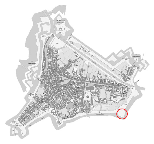 Het voormalige Kruitmagazijn, z.j.Toegeschreven aan M.J.C. Weegenaar, die veel vervalsingen gemaakt heeft(potlood- en pentekening 11.5 x 16.5 cm) Prentenkabinet Bibliotheek Provinciaal Genootschap, 's-Hertogenbosch Dit werd in 1742 gebouwd op het bolwerk Bazelaar. Het bolwerk kwam in 1623 gereed. |