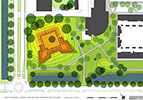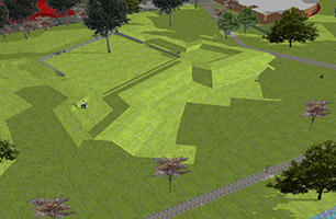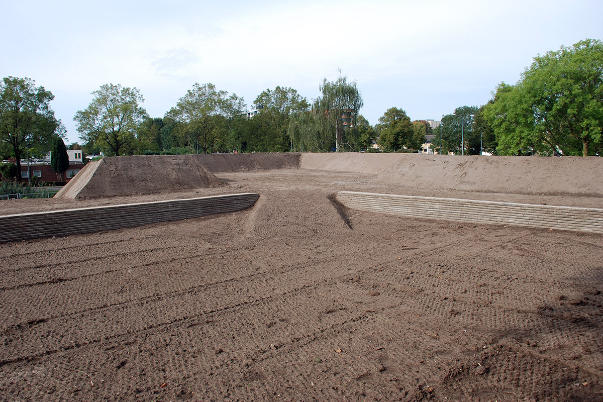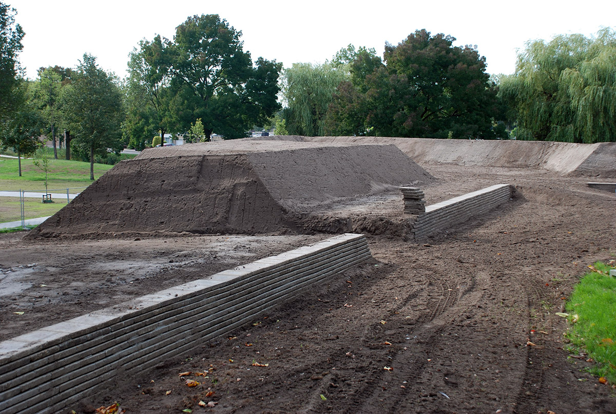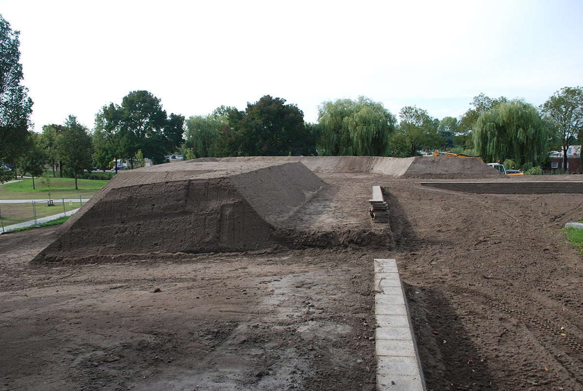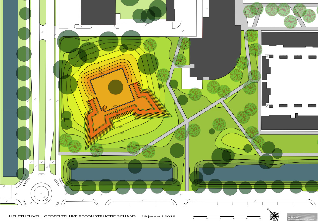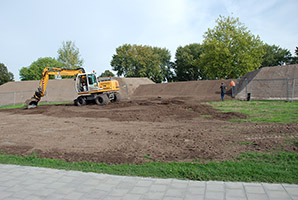 Schans Helftheuvel, het aanleggen van grondlichaam, zitrand van betontegels en aanbrengen cortenstalenplaten, bouwen, aanleggen.