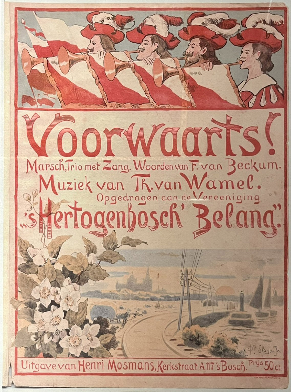 inventarisnummer: DIV 044De mars 'Voorwaarts' is gecomponeerd door dirigent / organist Theo van Wamel, in opdracht van de Vereeniging 's-Hertogenbosch Belang. Dit was een voorloper van de VVV. In de tekst beschreef hij de geschiedenis, kunst en handelsgeest van 's-Hertogenbosch. Piet Slager Jr. ontwierp het affiche. |