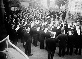 Koninklijk 's-Hertogenbosch' Mannenkoor in aktie in de Rivierenhal te Rotterdam in het kader van Den Bosch dankt Rotterdam.