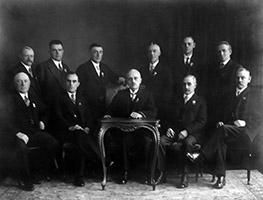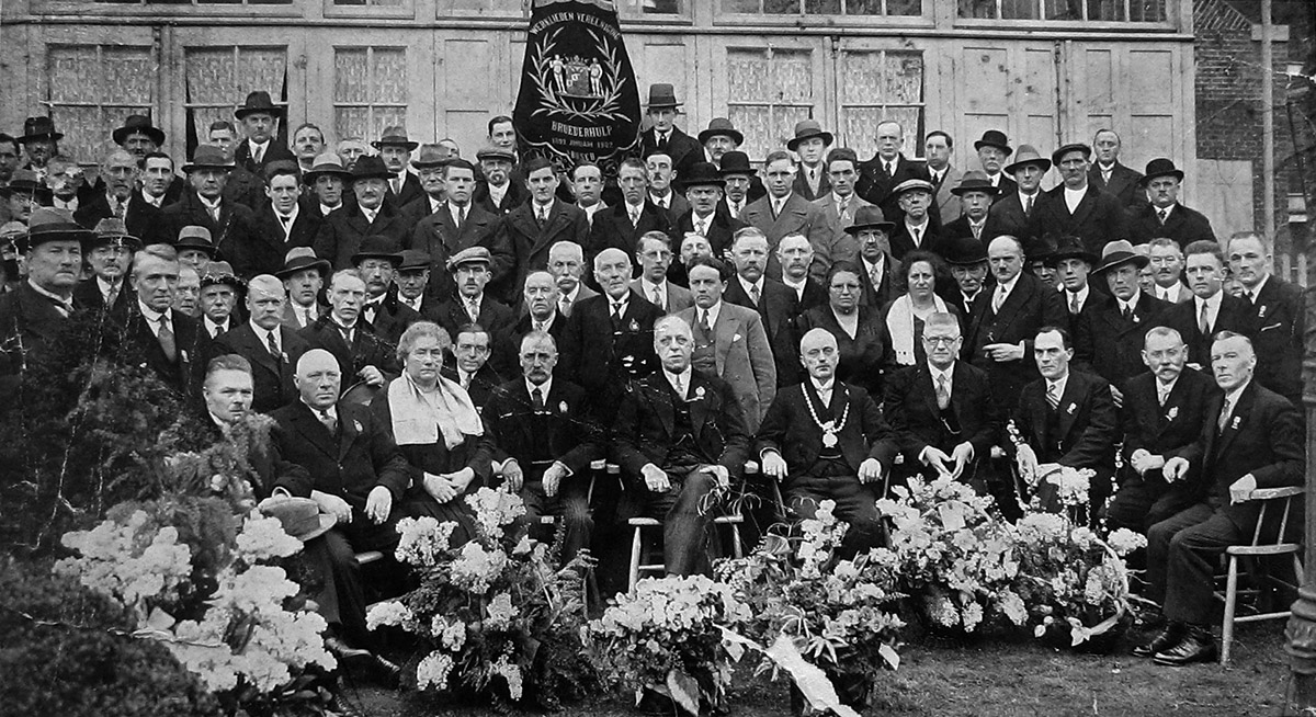Bestuur en feestcomite tijdens de viering van het 40-jarig bestaan van de 's-Hertogenbossche Ziekenkas 'Broederhulp' in Hotel-café-restaurant Hof van Brabant (waaronder Mr. Dr. van Leeuwen en A. Mathijsen) en leden (3e van rechts Jan van Rooij).