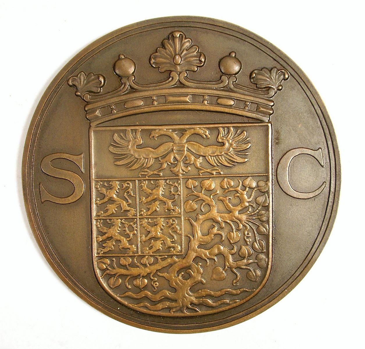 Penning, uitgegeven ter gelegenheid van de opening van de Veemarkthallen te ’s-Hertogenbosch, Vz: Wapen van ’s-Hertogenbosch tussen de letters S C. Kz: Afbeelding van de Veemarkthallen in vogelvlucht met daaronder het opschrift: 'Agricolarum lucro mercatorum commodo civium bono exstructum forum boarium MDCDXXXI'. Ontwerp Jac. van Goor. (K.B. 500). Brons, 60 mm.