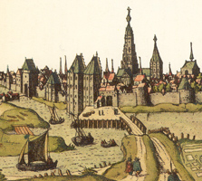 In 1591 al besloot het stadsbestuur deze beide spitsen van de torens af te breken. Bron: Tussen Sint Janspoort en Orthenpoort |