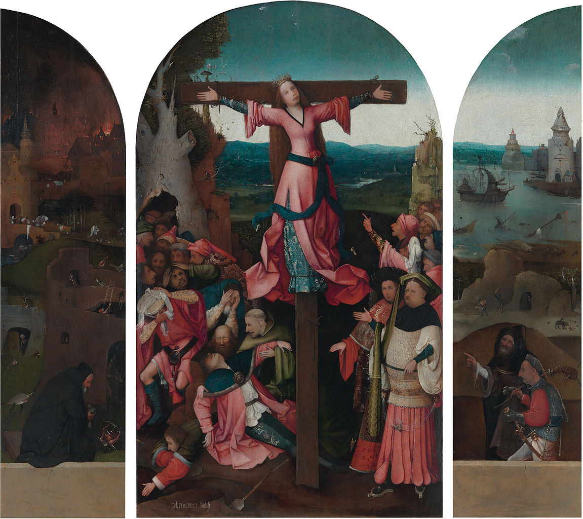 Wilgefortis was de dochter van een heidense koning. Om onder een niet-christelijk huwelijk uit te komen, bad ze God om redding. Door spontane baardgroei werd ze onaantrekkelijk en ging het niet door. Haar woedende vader liet haar kruisigen zoals ook Christus was gekruisigd - de enige man die zij in haar leven toeliet. De baard werd door Bosch subtiel weergegeven. Wegens veroudering van de verflaag was deze tot de recente restauratie van het drieluik nauwelijks zichtbaar. |
