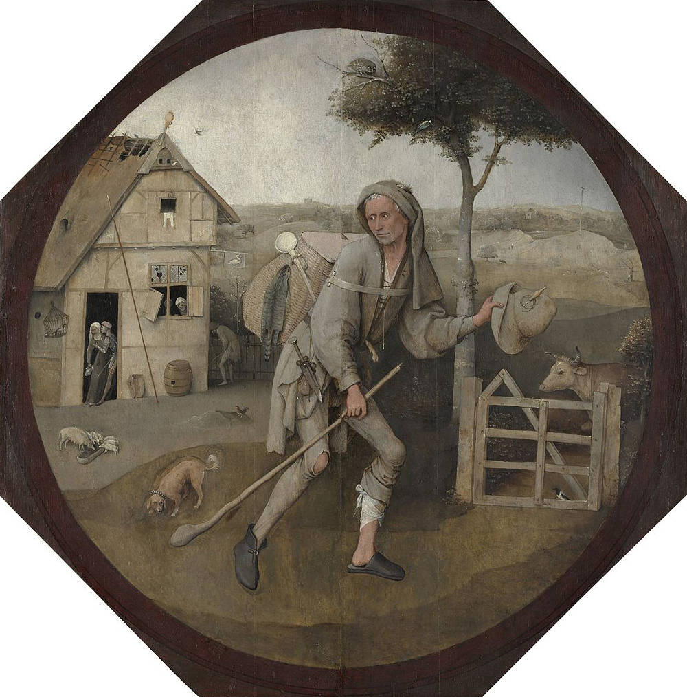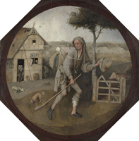 Een reiziger loopt voorbij een herberg. Het hek voor hem is gesloten. Waar komt hij vandaan en waar gaat hij heen? Sinds de vorige Jheronimus-Boschtentoonstelling weten we dat De landloper bestaat uit twee helften en de buitenkant is van een triptiek. Als levenspelgrim moet hij kiezen tussen goed en kwaad. Hoog in de boom loert de uil naar een koolmees die zich nergens van bewust is. Gevaar dreifgt overal en voor iedereen. |