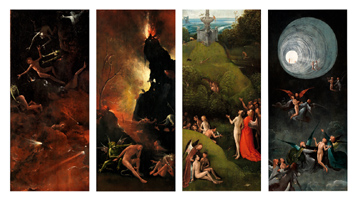 Op vier panelen schilderde Jheronimus Bosch een visionair beeld van het Einde der Tijden. Enerzijds is de weg van de gelukzalige zielen naar de hemel weergegeven en anderzijds de route van de verdoemden naar de hel. Vanuit het Aards Paradijs worden de zielen door engelen begeleid. Aan het einde van een spectaculaire tunnel bereiken zij de hemel. In het felle tegenlicht is als nauwelijks zichtbaar silhouet, een engel geschilderd die hen verwelkomt. |