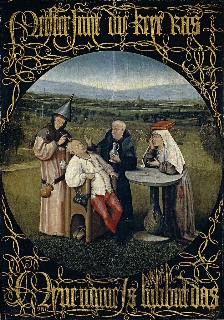 Het schilderij De keisnijding 'speelt' met de beschouwer. Voorstelling en tekst vullen elkaar aan. Uit het hoofd van de dikzak wordt de 'kei der dwazen' verwijderd. Er komt echter een bloemetje tevoorschijn en niet een steen: in het Middelnederlands betekent 'kei' zowel kiezelsteen als bloem. Voor de gehele compositie werd Bosch geïnspireerd door de wapenborden van het Gulden Vlies. De keisnijding is dan ook bedoeld als spot! |