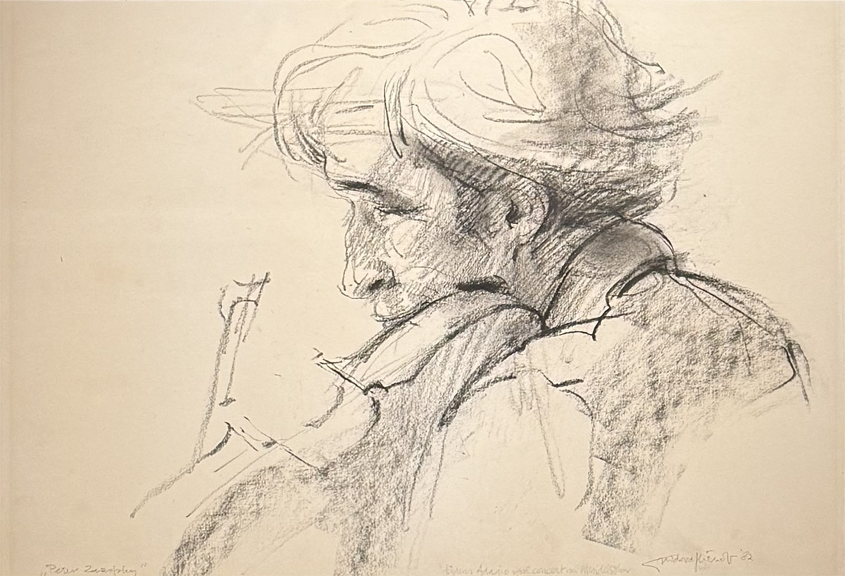 In zijn tijd bij het Brabants Orkest maakte Guido van de Griendt niet alleen groepsportretten, maar legde hij ook enkele solisten vast. Deze schitterende tekening is van de Amerikaanse violist Peter Zazofsky (1954) die opgaat in zijn spel. Het was voor Van de Griendt blijkbaar van belang om juist dit moment vast te leggen: op het vel schreef hij onderaan 'tijdens Adagio vioolconcert van Mendelssohn". Guido van de Griendt zal zeker ook geweten hebben dat Mendelssohn dit concert componeerde tussen zijn 12de en 14de jaar. Bewondering voor componist en violist. |