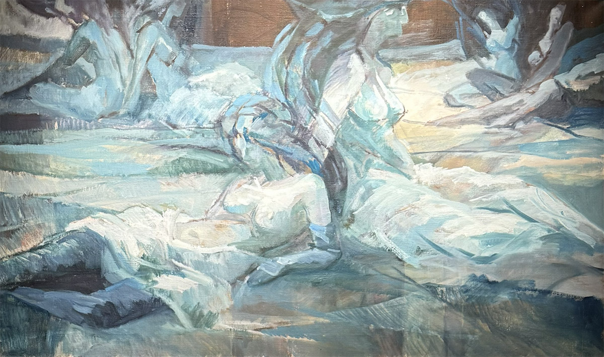 In 1975 werd Van de Griendt benaderd om een groot schilderij te maken met naakten in een landschappelijke omgeving. Het uiteindelijke werk mat 250 bij 150 centimeter en is later in kleinere stukken gesneden om in delen te worden verkocht. Bij de totstandkoming van deze voorstudie maakte Van de Griendt geen gebruik van modellen. Zijn kennis van de menselijke anatomie was zo goed dat hij uit het hoofd de figuren in elke gewenste houding kon weergeven. |