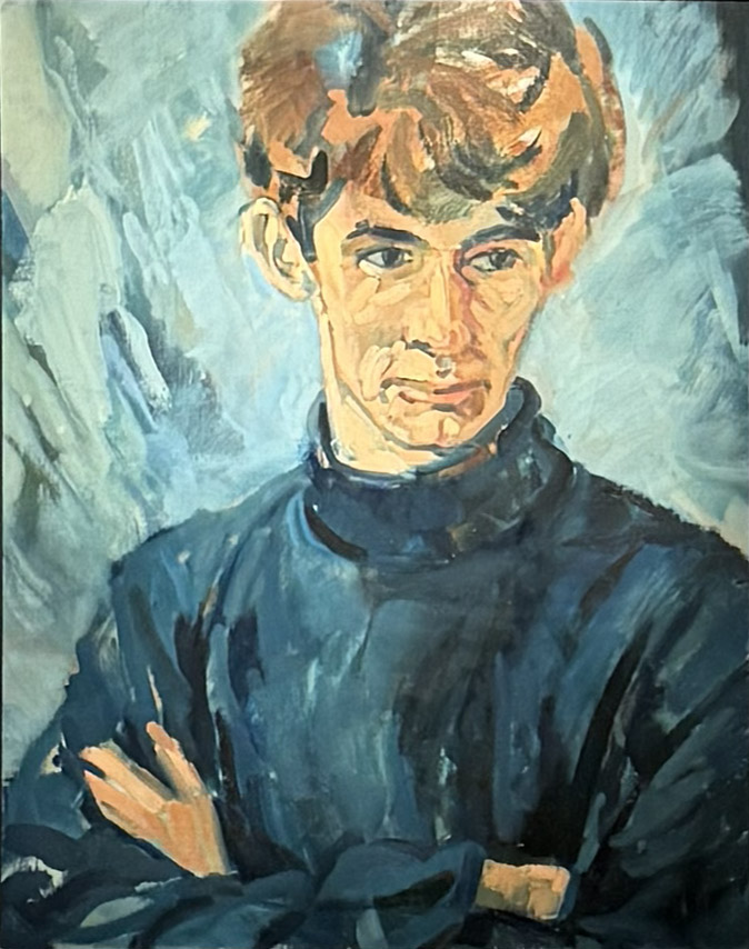 Met gekruiste armen poseerde Erik-Jonas, zoon van de kunstenaar voor dit portret. Het heeft alle kenmerken van het werk van Van de Griendt: de afzijdige blik, de verstilde houding, het hoofd wat net niet helemaal is weergegeven en natuurlijk weer de blauwe kleur die niet alleen in de achtergrond, maar ook in de kleding terugkomt. |