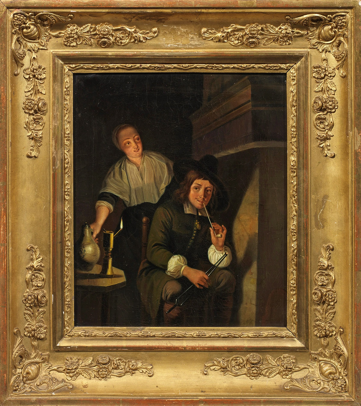 Interieurszene des 17. Jhs. mit einer Magd und einem jungen Herrn beim Anzünden seiner Pfeife