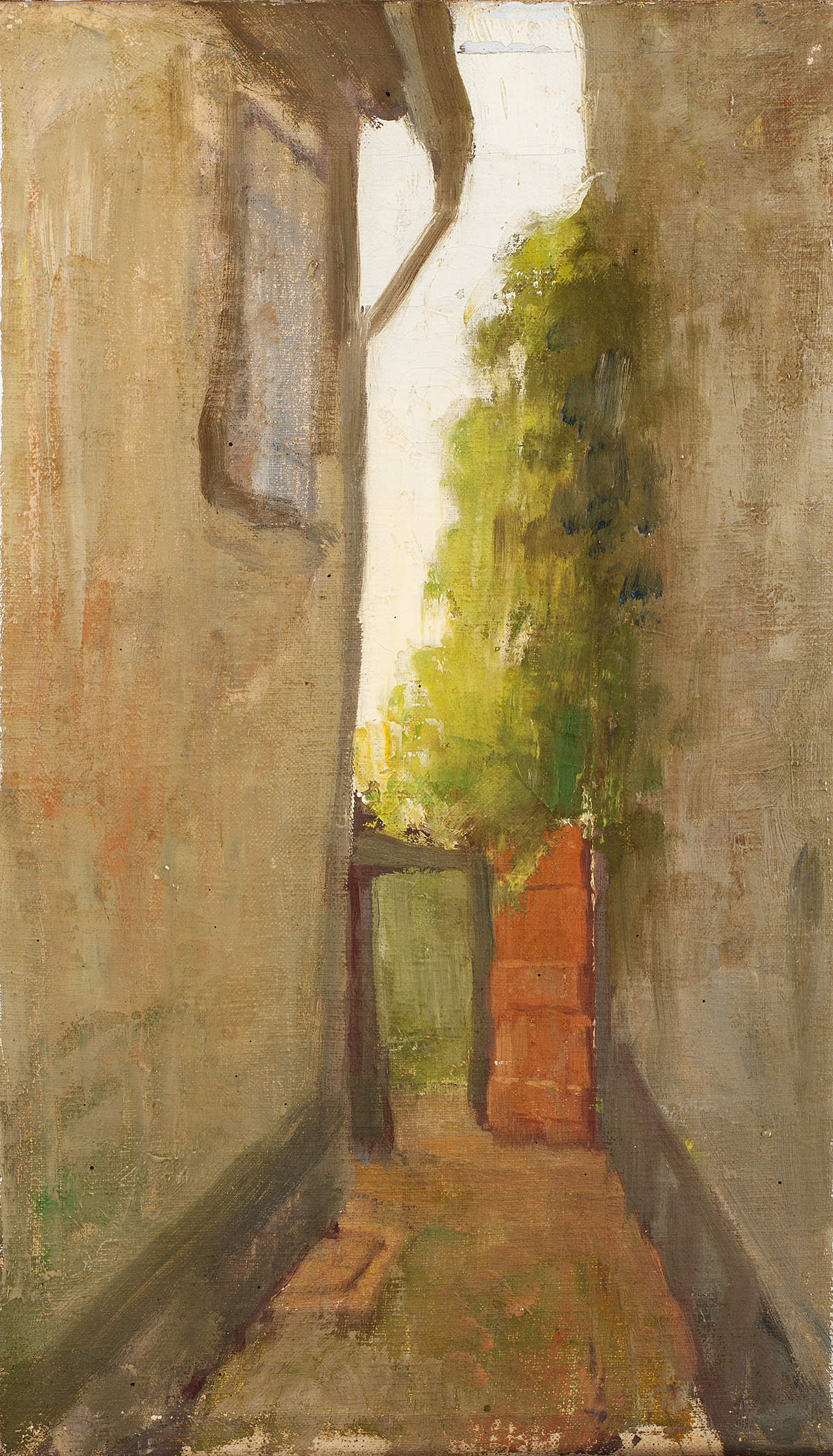 Op de achterzijde het opschrift: (spieraam): 'Straatje naast Hinthamereinde 51 waar Arnold geboren werd in 1923, 18 april. Th. Van de Laar'. |