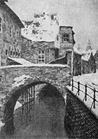 De Vughter- of Postelstroom in de Molenstraat gezien vanaf de Korenbrug. Links overkapping van het waterrad van de voormalige watermolen de Drie Kronen. Op de achtergrond de kerk van Sint Cathrien.
