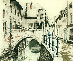 Gezicht op de Binnendieze (Vughterstroom) ter hoogte van de Molenstraat. Links de panden de Drie Kronen en De Swaen. Op de achtergrond de koepel van de kerk van Sint Cathrien (Kruiskerk). Niet gesigneerd of gedateerd. Afdruk heeft minder kleur dan record nr. 51795.