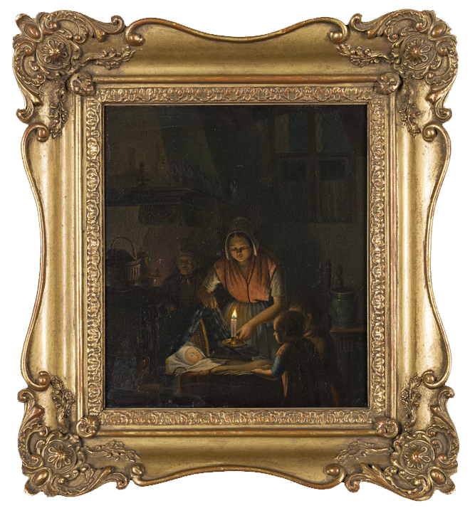 Schilderij met olieverf op paneel van een boereninterieur bij kaarslicht. Op de voorgrond een pasgeboren kind in een rieten wieg. De moeder tilt voorzichtig een kleed omhoog en verlicht zo de baby met kaarslicht. Twee kinderen kijken over de wieg naar de baby. Op de achtergrond het interieur waar een man op een stoel zit. Schilderij in vergulde lijst met op de hoeken ornamenten.