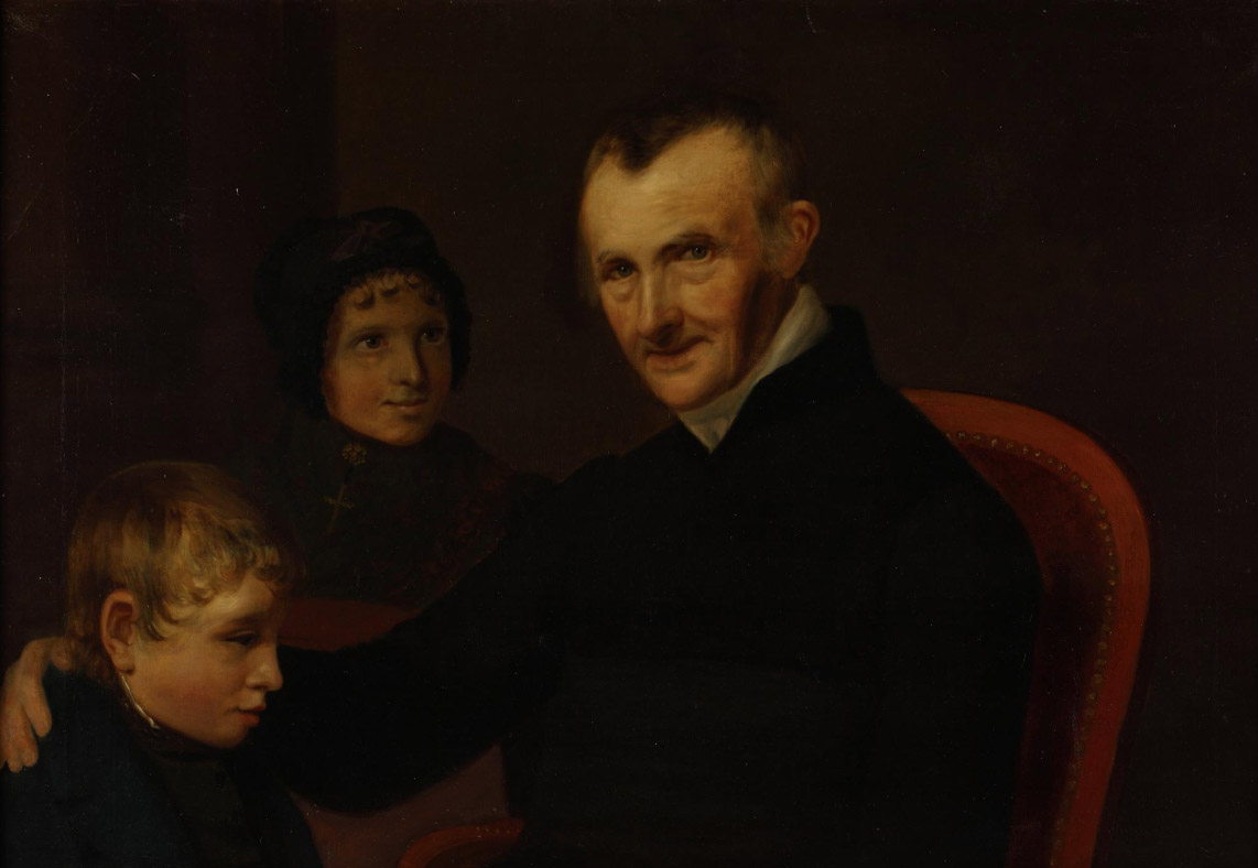 Jan Baptist Hoeck op oudere leeftijd met jongetje en meisje. Joannes Baptist / Jan Baptist van Hoeck (Helmond 1769 - Vlierden 1844) was sinds 1812 pastoor van Vlierden (toen een zelfstandige gemeente, nu onderdeel van Deurne).