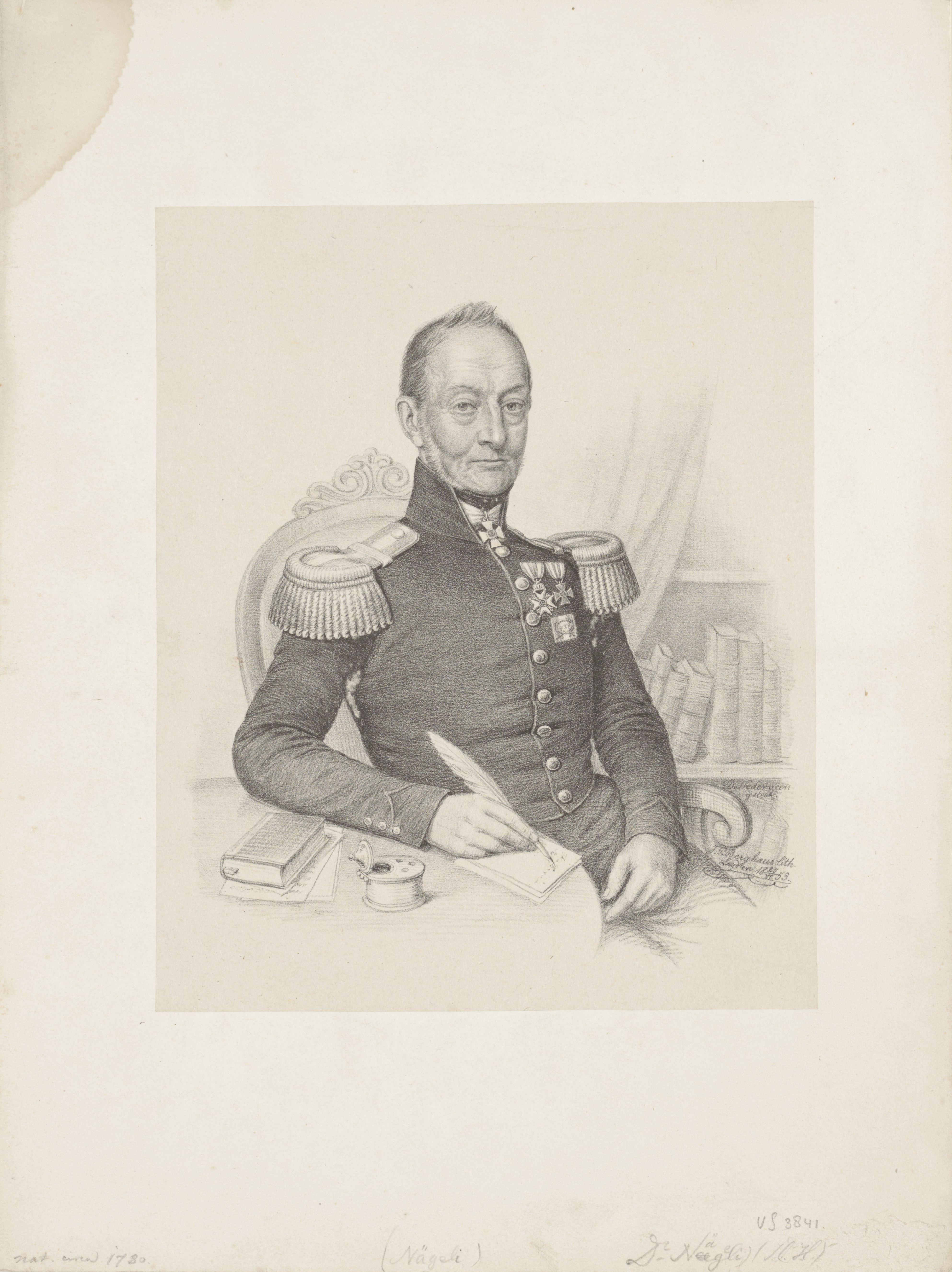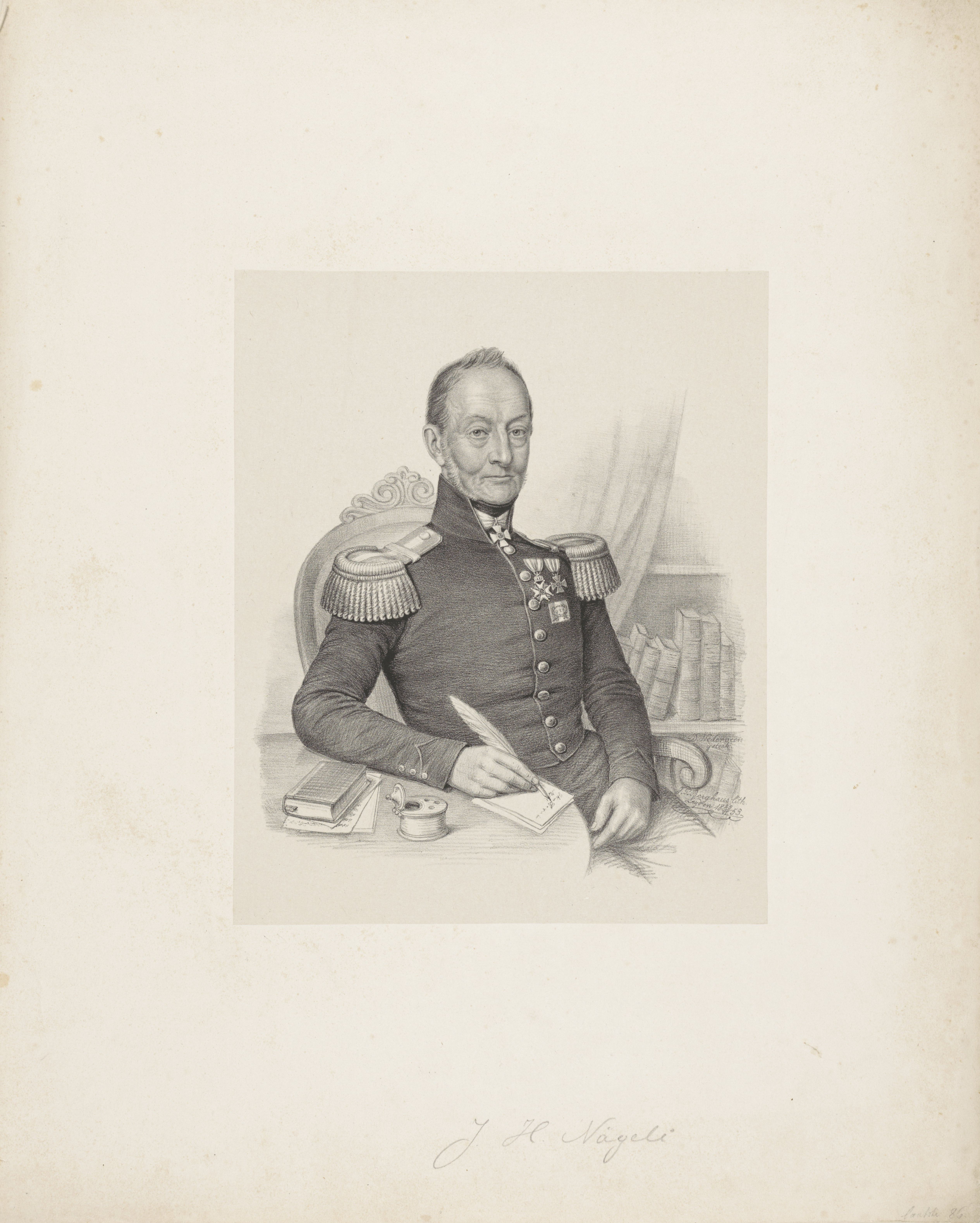 H. Heinrich Nägeli (Zürich 1784 - aldaar 1871). In 1854 vroeg en kreeg H. Heinrich Nägeli eervol ontslag als ‘Eerste officier van gezondheid der 1e klasse. ’De geboren Zwitser had er toen ruim 25 jaar dienst opzitten, eerst bij het garnizoen en vervolgens bij de Militaire Academie te Breda. Deze ´Ned. Hervormde´ ongehuwde man was zeer geliefd onder burgers en militairen in Breda. In 1867 zei de gewezen majoor-chirurgijn per advertentie de bevolking van die stad na 42 jaar vaarwel. Hetzelfde jaar ging de 83-jarige grijsaard terug naar familie in ´Helvetië´.