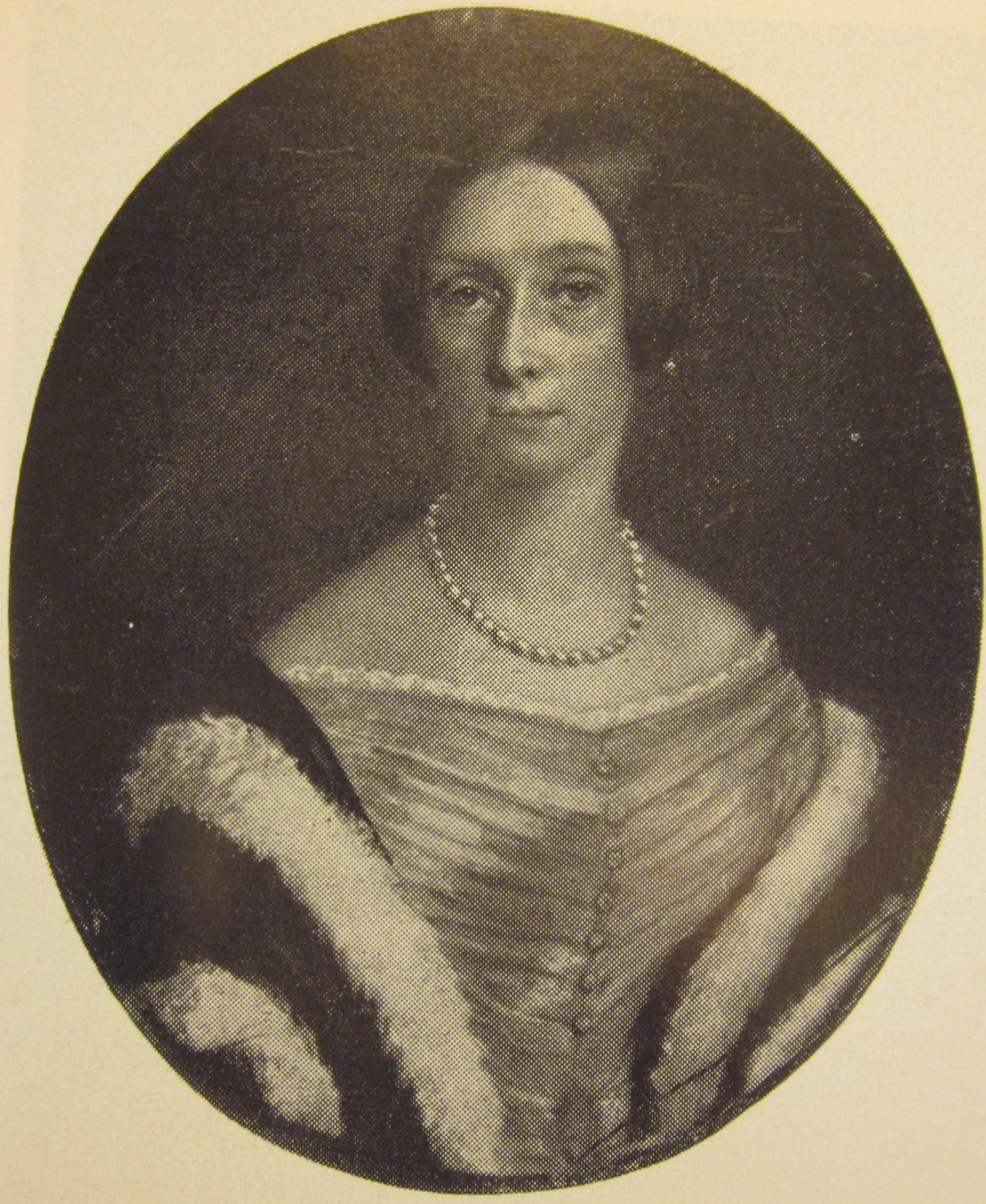 Halfportet van een rijpere dame met halssieraad en opgestoken donker haar; lichtkleurige pliché jurk die hals en schouders onbedekt laat; op de bovenarmen is een soort bontjas of stola gedrapeerd.