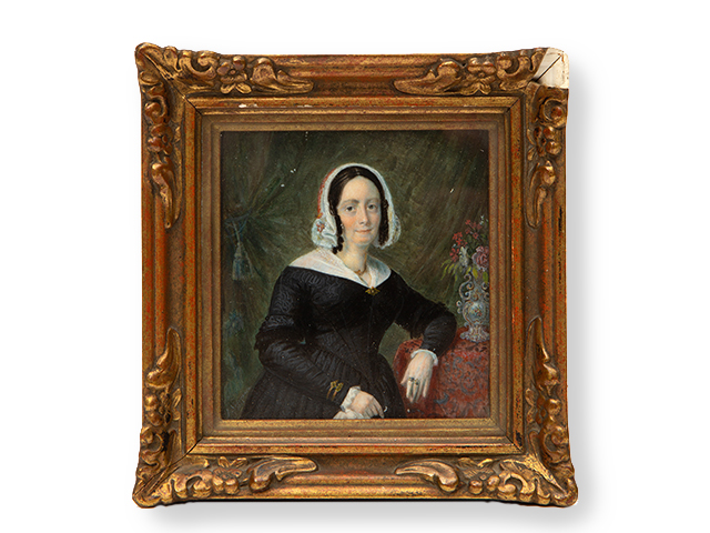 Halffiguur gezeten aan een tafel met daarop een vaas met bloemen; de dame is zwart gekleed; kraag en muts zijn van witte kant (RG).