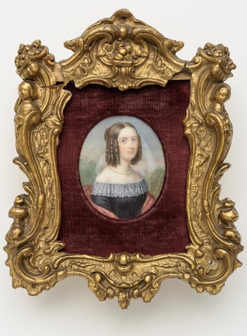 Staand ovaal; hoogte 7.9 cm, breedte 6.4 cm (binnenmaten), in veel grotere rechthoekige lijst die met roodbruin fluweel overtrokken is, daaromheen zit een goudkleurige lijst met grote krullen.