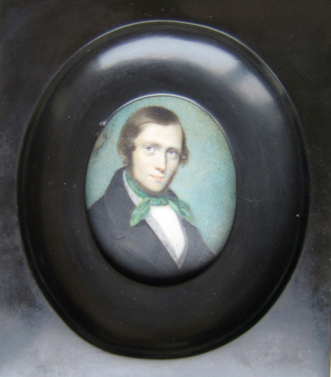 Staand ovaal, miniatuur op ivoor in zware zwartstenen rechthoekige lijst; achter plat stukje glas met ruwe rand; (water?)verf op ivoor.