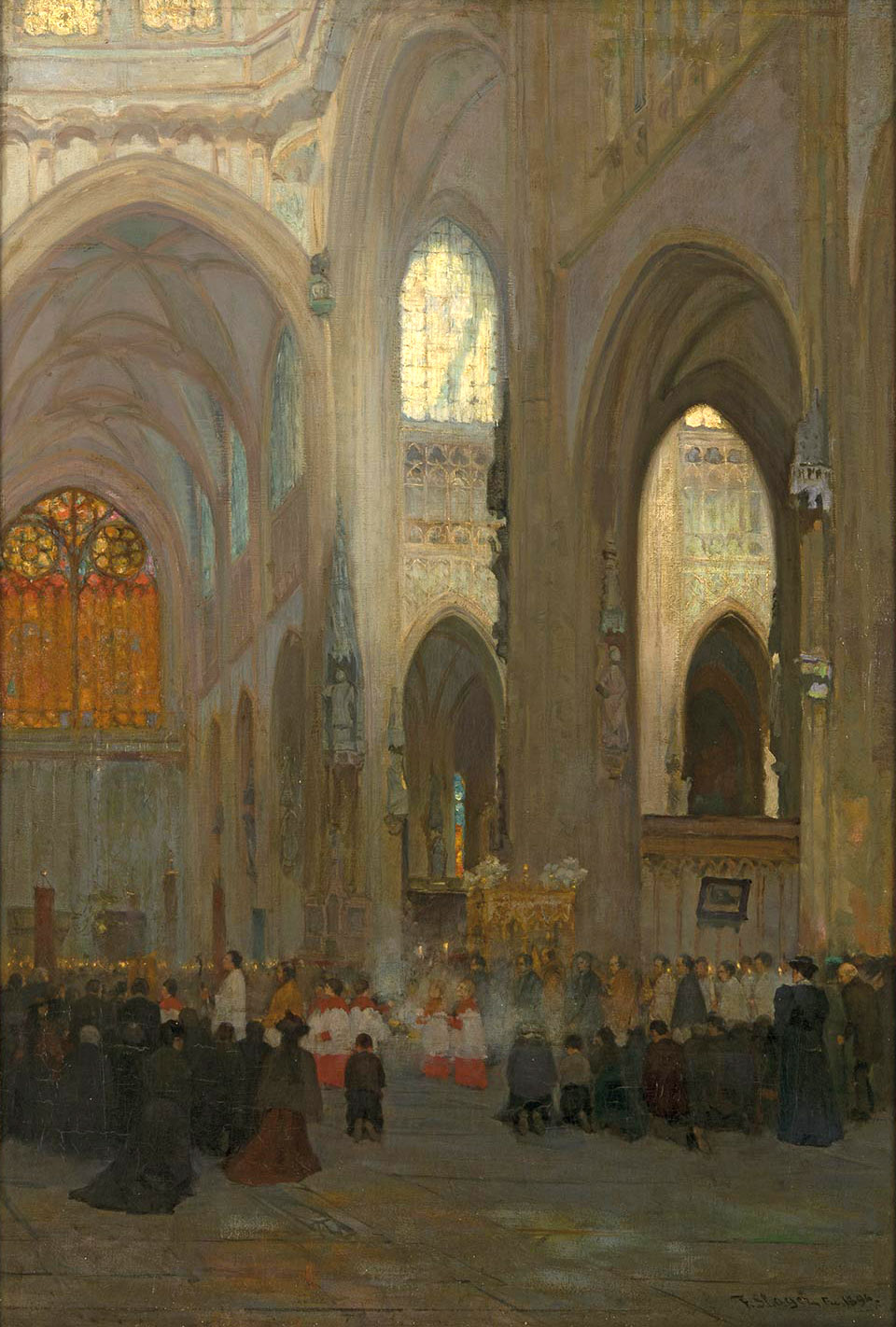 Stemmiger getint is een gezicht op het koor der kathedraal, geschilderd door Frans Slager, die ook fraaie, stemmingvolle zwart- en witteekeningen exposeerde van de oude sacristie en van het inwendige der kathedraal bij gelegenheid eener processie (welke laatste in de Katholieke Illustratie gereproduceerd werd). ...